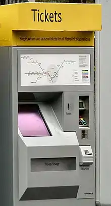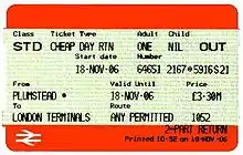 The machines have two printers which can print on, and encode the magnetic stripes on the rear of, Rail Settlement Plan-accredited ticket stock.[9] This has a batch code of RSP No. 9399 and consists of fanfold (concertina-style) packs of round-cornered tickets joined to each other by perforated lugs which are cut during the printing process. An experimental ticket stock with diagonal corners was used in the earliest trial machines.[38] In common with other "New Generation" (post-privatisation) ticket issuing systems, the ticket stock has no pre-printed data other than some conditions on the reverse; all data is printed by the machine.[39] Machines accept either payment cards only or both cards and cash. On the latter, banknotes and coins are checked electronically.[9] Keypads for Chip and PIN card payments were fitted retrospectively on older machines, and as standard on newer machines, when this technology was introduced.[40]