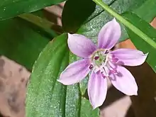 The habitat is moist sites on the forest floor, it grows to 20 cm high. Leaves are hairless, egg-shaped to lanceolate in shape 20 to 50 mm long, 7 to 18 mm wide, with wavy edges.[2] Attractive flowers form in spring. The six petals are pink with purple anthers, flowers around 15 mm across. A wrinkled ovoid capsule forms, 2 to 4 mm wide. Inside are a small number of yellow or brown seeds.