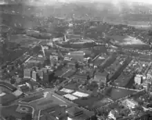 The site of Schenley Plaza was originally a deep gully which was called St. Pierre Hollow as it was near the end of St. Pierre Street (now Bigelow Boulevard).[3] In 1898, a stone arch bridge called the Bellefield Bridge was built over the hollow, which together with the Schenley Bridge provided an entrance into Schenley Park from Forbes Avenue.[4]