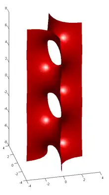 In mathematics, a Scherk surface (named after Heinrich Scherk) is an example of a minimal surface. Scherk described two complete embedded minimal surfaces in 1834;[1] his first surface is a doubly periodic surface, his second surface is singly periodic. They were the third non-trivial examples of minimal surfaces (the first two were the catenoid and helicoid).[2] The two surfaces are conjugates of each other.
