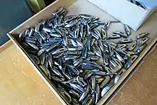 The Schiffli machine used two threads – one on the front side and one on the back side of the fabric. The first thread is entwined with the second thread to form a lock stitch. The front side thread, or embroidery yarn, is held on a spool, or rather a creel of spools. A boat-shaped (German: schiffli) shuttle carries the bobbin thread, which is also known as the schiffli yarn. There is one shuttle per needle.[3] When the front-side needle pierces the fabric it passes the embroidery thread through the fabric from front to rear. As the needle withdraws it forms a loop on the back side of the material. The shuttle which trails the bobbin thread passes through this loop. Finally, the front-side thread is pulled tight.