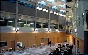 The Science Center involved the renovation of 100,000 square feet (9,290 m²) of indoor space, including physically connecting the two old science facilities, constructing 52,000 square feet (4,830 m²) of additional space, and creating an expanded and integrated science library, amphitheatre, and three-story atrium.[1]