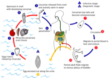 S. haematobium completes it life cycle in humans, as definitive hosts, and freshwater snails, as intermediate hosts, just like other schistosomes. But unlike other schistosomes that release eggs in the intestine, it releases its eggs in the urinary tract and excrete along with the urine.[15] In stagnant freshwater, the eggs hatch within 15 minutes into the larvae called miracidia. Each miracidium is either male or female.[25] Miracidia are covered with hair-like cilia with which actively swims searching for snails. Unless they infect a snail within 24–28 hours, they run out of energy (glycogen) reserves and die. Species of snail belonging to the genus Bulinus, including B. globosus, B. forskalii, B. nasutus, B. nyassanus, and B. truncatus, can harbour the miracidia.[26] The miracidia simply pierce through the soft skin of the snail and move to the liver. Inside the snail, their cilia is cast off and extra-epithelial covering forms within 24 hours. Then they transform into sporocysts and undergo active cell division after two weeks. The mother sporocyst produces many daughter sporocysts. Each daughter sporocyst forms new larvae called cercariae. One mother sporocyst produces half a million cercariae. After a month, the sporocysts rupture and cercariae are liberated. Free cercariae penetrate the liver and move out of the snail into water. Each cercaria has a biforked tail with which it swims to find a human host. Again the cercariae are short lived and can survive in water for 4–6 days unless they find a human host.[27]