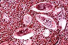 Individuals sort out opposite sexes. The female body becomes enveloped within the rolled-up gynaecophoric canal of the male; thus, becoming partners for life. Sexual maturation is attained after 4–6 weeks of initial infection. A female generally lays 500–1,000 eggs in a day.[27] The female only leaves the male briefly for laying eggs. It has to because only it can enter the small and narrow peripheral venule in the submucosa so that the eggs can be released into the bladder. The embryonated eggs penetrate the bladder mucosa using proteolytic enzymes, aided by their terminal spines and by the contraction of the bladder. The enzyme is a toxin specifically for damaging (necrosis) the tissue. Under normal situation, the eggs released into the bladder do not cause pathological symptoms. But eggs often fail to penetrate the bladder mucosa and remain trapped in the bladder wall; it is these which produce the lesions by releasing their antigens and provoking granuloma formation. Granulomata in turn coalesce to form tubercles, nodules or masses that often ulcerate. This is the condition behind the pathological lesions found in the bladder wall, ureter and renal; and also tumour, both benign and malignant.[30][31] The fluke continuously lays eggs throughout their life. An average lifespan is 3–4 years.[32]