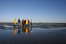 The national park has 70 neighbouring communities in Schleswig-Holstein with 290.000 people living there. Additionally approximately 15 Million people visit the national park every year.[43] The area of the Wadden Sea National Park is harnessed by tourism, fishery, oil production, coastal defence, grazing, maritime traffic and air traffic, withdrawal of gravel and sand, mussel cultivation and sometimes used for military weapon testing. Most of the utilisation is located directly near or at the coast, so the seaward area is more or less unaffected by human influences.[3] Since the amendment of the second national park law in 1999 mainly voluntary agreements coordinate the limitation in human utilisation of the Wadden Sea. The consideration of traditional usages highly increased the approval of the national park by locals.[44] Since 1987 utilisations, which hardly affect the ecosystem Wadden Sea at all, are allowed again by law. Such utilisations are e.g. collecting small amounts of plants for science or education.[13]