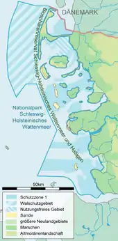 The national park divides into two zones that correspond to different levels of protection. Zone 1 has a size of 162.000 ha and covers a third of the whole national park. The zone consists of 12 bigger units which all contain marshland, intertidal estuarine mudflat, mixed sediment mudflat, sand flat, tidal creeks as well as deep and flat areas that are permanently under water (sublittoral). Additionally there are smaller units around sensible places like breeding areas of coastal birds, sandbars of seals, places where migratory birds moult or geomorphological meaningful areas with natural surface structure.[7] Zone 1 is principally closed for the public. Exceptions are made for the mudflat areas directly bordering the coastline, some routes for guided mudflat hiking tours and fishery.[8] South of the Hindenburgdamm, facing the landside of Sylt, a human use of the first zone is completely prohibited (Zero use zone). This part is 12.500 ha big, whereof 3500 ha are permanently covered with water.