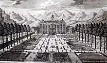 The main building of the palace has three storeys and a hip roof with waterspouts in the shape of dragons; the central portion has a mezzanine and the corner bays an additional half storey. There were originally three wings forming a large enclosed courtyard on the east side, of which two remain. A solid clock tower rises above the central bay facing this courtyard. The interior is sumptuously decorated with frescos, paintings, statues, ornamented pillars and chandeliers. The chapel was finished in 1722. Formal gardens in the style of Versailles were laid out by Matthias Diesel.