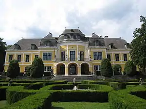 The present-day palace was built around 1697 at the behest of Count Theodor von Strattmann, most probably according to plans designed by Johann Bernhard Fischer von Erlach, and surrounded by a French formal garden. In 1765 Field Marshal Count Franz Moritz von Lacy, confidant of Empress Maria Theresa and her son Joseph II, purchased the estate. He had the building again enlarged and the English landscape park laid out, one of the first in the Habsburg monarchy. It included 17 reed cottages on the Hameau (French for "hamlet") hill to accommodate Lacy's guests, as well as a mausoleum built in 1794 that became his last resting place. When he opened his gardens to the public, they became a popular destination for Vienna day-trippers.