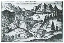 The ecclesiastical divisions also followed this border: Scharnitz belonged to the Bishopric of Freising, Seefeld and Oberleutasch to the Bishopric of Brixen.[1] Nevertheless the County of Werdenfels, maintained territorial claims up to the outskirts of Seefeld, citing the bishopric's borders of 1060 and later, unilateral, boundary records. The aim of the County of Tyrol was, by contrast, to push the state border up to the strategically important Scharnitz Pass.[2]