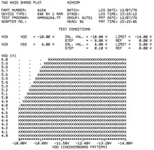Automated test equipment have traditionally generated a two-dimensional, ASCII form of the shmoo plot that uses an "X" to represent functional points and blank space for non-functional points. In modern times plots with two colors (e.g. red/green) or even multi colored plots in form of digital spread sheet documents and alike became also common, even if the traditional form is still in use.[5] For testing efficiency sometimes only the border of interest (where a certain value changes its state) is backed up with data in the diagrams thus (often reasonably) assuming the areas outside those transition will stay at those state.[6]