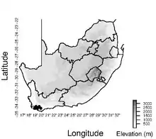 Schoenus purpurascens has a relatively narrow distribution, centered on the Caledon region of the southwestern part of the Western Cape Province of South Africa.[1] This species usually grows on moist to well-drained mountain slopes, ranging from 275 to over 1000 m in elevation.[1]