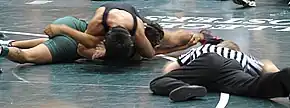 ![]() Two high school wrestlers competing in a match, with one wrestler attempting to finish a double leg takedown | |