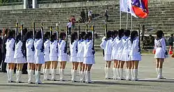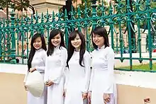 In the Islamic Republic of Afghanistan, Afghan schoolgirls were required to wear white headscarves and black knee-length dresses over leggings.[4] In 2017, President Ashraf Ghani blocked a directive by the Ministry of Education obliging girls aged 12 and over to wear floor-length tunics.[5]
