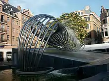 On top of the entrance to this parking garage, there is a curved fountain, De Golf ("the Wave"), sculpted by the artist Olivier Strebelle.