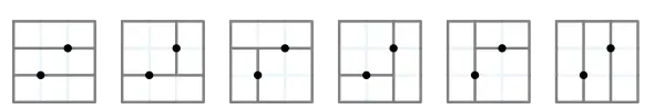 Similarly, the Schröder numbers count the number of ways to divide a rectangle into smaller rectangles using cuts through points given inside the rectangle in general position, each cut intersecting one of the points and dividing only a single rectangle in two (i.e., the number of structurally-different guillotine partitions). This is similar to the process of triangulation, in which a shape is divided into nonoverlapping triangles instead of rectangles. The following figure shows the 6 such dissections of a rectangle into 3 rectangles using two cuts: