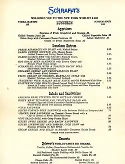 The first location to serve food was the Syracuse store in 1906.[2] By 1909 Jane introduced meals to the second New York City Schrafft's, at 54 West 23rd Street in the heart of the Ladies' Mile shopping district. By 1927 there were 25 units, mostly in New York, and by 1928 Schrafft's revenue from lunch sales was US$1 million a month.[1]