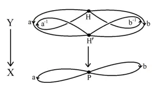 A short proof of the Nielsen–Schreier theorem uses the algebraic topology of fundamental groups and covering spaces.[1] A free group G on a set of generators is the fundamental group of a bouquet of circles, a topological graph X with a single vertex and with a loop-edge for each generator.[6] Any subgroup H of the fundamental group is itself the fundamental group of a connected covering space Y → X. The space Y is a (possibly infinite) topological graph, the Schreier coset graph having one vertex for each coset in G/H.[7] In any connected topological graph, it is possible to shrink the edges of a spanning tree of the graph, producing a bouquet of circles that has the same fundamental group H. Since H is the fundamental group of a bouquet of circles, it is itself free.[6]