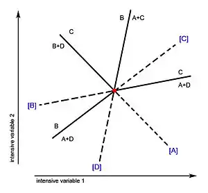 Univariant lines are sometimes called reaction lines. The extension of a univariant line through the invariant point is called the metastable extension. Univariant lines are usually drawn as a solid line while their metastable extensions are drawn as a dotted line.