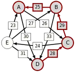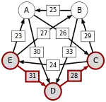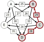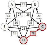 Now the strongest paths have to be identified. To help visualize the strongest paths, the set of pairwise preferences is depicted in the diagram on the right in the form of a directed graph. An arrow from the node representing a candidate X to the one representing a candidate Y is labelled with d[X, Y]. To avoid cluttering the diagram, an arrow has only been drawn from X to Y when d[X, Y] > d[Y, X] (i.e. the table cells with light green background), omitting the one in the opposite direction (the table cells with light red background).