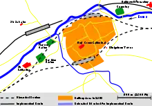 The first options would have meant passing through parks or the built-up area and the future expansion of the city would have been affected. It was decided that the line would run north of the Rems, which meant that the station would be away from the city centre. It also required the relocation of the Rems river, which would protect the city against flooding.[4][5]
