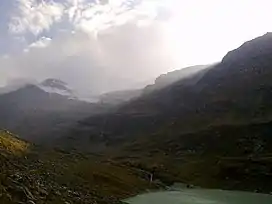 ![]() View of Lake Mattmark and the chain between Monte Moro and Schwarzberghorn from Distelalp in the Saas valley (Valais). | |
