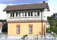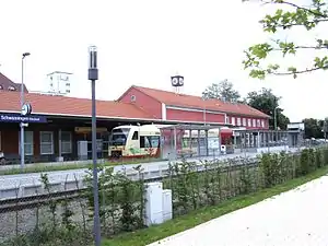 Schwenningen (Neckar) station is one of two stations in Villingen-Schwenningen in the German state of Baden-Württemberg. The other is Villingen (Schwarzwald). Schwenningen owes its connection to the railway to Johannes Bürk, who had demanded a route through Schwenningen to promote the local watch industry, which included his own factory. The original plans involved a route through Niedereschach.[6] The station is located at the Neckar, south of central Schwenningen. It is located at 695 metres (2,280 feet) above sea level on the Rottweil–Villingen railway. Originally the station was 540 metres (1,770 feet) long and up to 56 metres (184 feet) wide. The complex included a station building and a goods shed.[7]