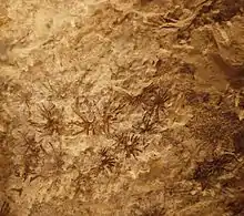 Sciadophyton is a morphotaxon of lower Devonian plants known only from compression fossils.[2][3] It is interpreted as the monoicous gametophyte of a vascular land plant, because its vascularised branches end in a cup-shaped structure bearing gametangia, both antheridia and archegonia,[4] but little structural information is preserved at the cellular level. It formed rosettes of stems, which may have radiated from a basal gametophytic corm-like thallus or from a central 'stem' or even from a root system, although there is not enough evidence to discriminate between these possibilities.[3]
