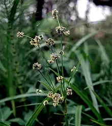 Scirpus microcarpus is a species of flowering plant in the sedge family known by the common names panicled bulrush, smallfruit bulrush, and barberpole bulrush. It is native to North America, where it can be found throughout the northern and western regions, from Alaska across Canada to the northeastern United States, in most of the central and western states, and in Baja California. It grows in many types of moist and wet habitat. It is a perennial herb growing from a long rhizome system. The erect, three-angled stems often exceed one meter tall. Sheathing leaves occur at the stem bases as well as higher up the stems. The inflorescence is a panicle of many clusters of spikelets and leaflike bracts on long, thin branches. The fruit is a pale, smooth achene less than 2 millimeters long.