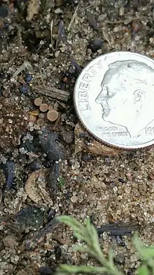 This image captures a cluster of apothecia from a downward angle, so that only the tops are visible. The apothecia in this photo are circular, tan, and have a white lining near the edge of the structure. For size reference, a dime is also included.
