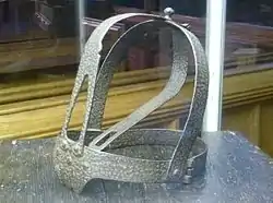 A scold's bridle, sometimes called a witch's bridle, a gossip's bridle, a brank's bridle, or simply branks,[1] was an instrument of punishment, as a form of public humiliation.[2] It was an iron muzzle in an iron framework that enclosed the head (although some bridles were masks that depicted suffering). A bridle-bit (or curb-plate), about 5 cm × 2.5 cm (2 in × 1 in) in size, was slid into the mouth and pressed down on top of the tongue, often with a spike on the tongue, as a compress. It functioned to silence the wearer from speaking entirely, and caused extreme pain and physiological trauma to scare and intimidate the wearer into submission. The scold's bridle was used on men and women.[3] This prevented speaking and resulted in many unpleasant side effects for the wearer, including excessive salivation and fatigue in the mouth. For extra humiliation, a bell could also be attached to draw in crowds. The wearer was then led around town by a leash.
