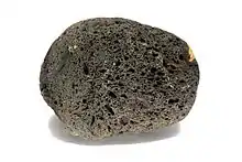 Scoria is a pyroclastic, highly vesicular, dark-colored volcanic rock that was ejected from a volcano as a molten blob and cooled in the air to form discrete grains or clasts.[1][2] It is typically dark in color (generally dark brown, black or purplish-red), and basaltic or andesitic in composition. Scoria is relatively low in density as a result of its numerous macroscopic ellipsoidal vesicles, but in contrast to pumice, all scoria has a specific gravity greater than 1 and sinks in water.