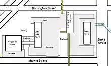 - Three-level pedway going from Barrington & Duke Towers to a stairwell, which leads to parking and the mall. The middle level of this pedway joins up to the Brunswick Street Pedway mentioned above.[23][30]