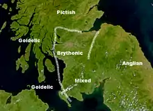 Place-name evidence, particularly the use of the prefix "pit", meaning land or a field, suggests that the heaviest areas of Pictish settlement were in modern Fife, Perthshire, Angus, Aberdeen and around the Moray Firth, although later Gaelic migration may have erased some Pictish names from the record.[5] Early Gaelic settlement appears to have been in the regions of the western mainland of Scotland between Cowal and Ardnamurchan, and the adjacent islands, later extending up the West coast in the 8th century.[45] There is place name and archaeological evidence of Anglian settlement in south-east Scotland reaching into West Lothian, and to a lesser extent into south-western Scotland.[46] Later Norse settlement was probably most extensive in Orkney and Shetland, with lighter settlement in the western islands, particularly the Hebrides and on the mainland in Caithness, stretching along fertile river valleys through Sutherland and into Ross. There was also extensive Viking settlement in Bernicia, the Northern part of Northumbria, which stretched into the modern Borders and Lowlands.[47]