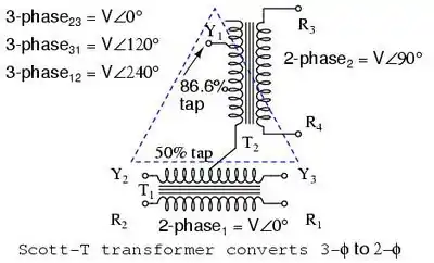 A Scott-T transformer (also called a Scott connection) is a type of circuit used to produce two-phase electric power (2 φ, 90 degree phase rotation)[1] from a three-phase (3 φ, 120 degree phase rotation) source, or vice versa. The Scott connection evenly distributes a balanced load between the phases of the source. The Scott three-phase transformer was invented by a Westinghouse engineer Charles F. Scott in the late 1890s to bypass Thomas Edison's more expensive rotary converter and thereby permit two-phase generator plants to drive three-phase motors.[2]