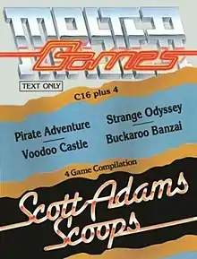 Scott Adams Scoops is a compilation of video games designed by Scott Adams and published by U.S. Gold for a variety of home computers: Pirate Adventure, Strange Odyssey, Voodoo Castle, and Buckaroo Banzai.