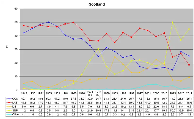 The aggregate votes of all Scottish constituencies for the 2019 general election are as follows: