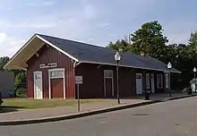 Scottsburg is a historic railroad depot located at Scottsburg, Scott County, Indiana. It was built in 1872 by the Jeffersonville, Madison and Indianapolis Railroad,[2] costing almost $1,492 (equivalent to $33,748 in 2021). It is a one-story, Stick Style frame building with board and batten siding and a projecting agent's window. Its presence influenced the location of Scottsburg in 1874, as the town was named for the railroad's General Superintendent, Horace Scott. It was built specifically for both passenger and freight cargo. Inside there was separate waiting rooms for men and women. Passenger service to the station ended in the 1950s.[2] It is one of the last structures of its kind still standing in Indiana.[3]