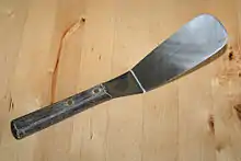 The pan scraper is, as the name suggests, an implement designed for the forcible removal of tightly stuck or burned food from the bottom of pots and pans before washing. They usually resemble a putty knife with a metal blade and a metal, wood, or plastic handle, sometimes with the handle mounted at an angle to the blade to allow for more vigorous scraping parallel to the surface; others, however, are a wedge shaped piece of hard plastic molded to fit the hand and with a slightly rounded sharp edge.