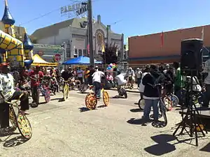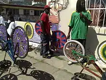A scraper bike is a bicycle that has been modified by its owner, often with decorated spokes with matching body and wheel colors, using tinfoil, re-used cardboard, candy wrappers and paint. The bike frames themselves are also modified with BMX frames, heightened seats, or custom pieces to create unique bicycles.[1] Scraper Bikes are an offshoot of the 90's era scraper culture of car modification.[2][3]