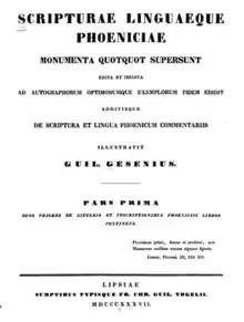 - Gesenius, F.H.W. (1837). Scripturae linguaeque phoeniciae monumenta quotquot supersunt edita et inedita ad autographorum optimorumque exemplorum fidem edidit additisque de scriptura et lingua Phoenicum commentariis illustravit Guil. Gesenius: Duos priores de litteris et inscriptionibus phoeniciis libros continens. 1 (in Latin). Vol. 1. sumptibus typisque Fr. Chr. Guil. Vogelii.