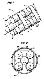 A scrollerwheel is a mechanical device composed of a number of rollers (four or more) and connective bands under tension, which wrap around and weave between the rollers forming a self-supporting cluster possessing a central roller. The cluster of rollers is bound by the connective bands in such a way that the static friction between the rollers and bands prevent the rollers from slipping as they roll and orbit the central roller.[1] Scrollerwheels are related in operational principle to rolamite linear bearings (developed at Sandia National Labs in the late 1960s), and like them, they display only rolling friction, and not the kinetic friction inherent in most mechanical bearings.