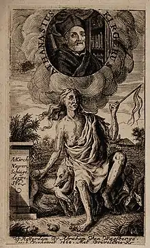 Later editions of the work were published in Leipzig by Johannes Baverus in 1659, 1671 and 1674. A Dutch translation was published in Amsterdam by Johannes van Waesbergen in 1669, and a German translation by J.C. Brandan in Augsburg in 1680.[3]: xxxiv The Waesbergern translation carried a frontispiece depicting a woman covered in buboes. Above her hangs a portrait of Kircher.[13] The wolf next to her may be a reference to the Romulus and Remus myth, symbolising Rome.[1] She is stepping on a toad, mentioned in the book both as the product of spontaneous generation and as a protective against the plague.
