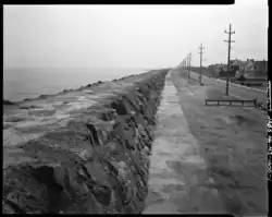 New Jersey Southern Railroad built a 2,000-foot trestle and a seawall on the ocean side of the narrow peninsula in the 1870s, and rebuilt it again in 1881.[15] To protect Fort Hancock the U.S. Army constructed a seawall between Sandy Hook and Sea Bright in 1898. At times there was not beachfront between Sandy Hook and Long Branch.[16] The seawall was built in phases between 1914 and 1962.[17][18] The parent of NJS, the Central Railroad of New Jersey abandoned the property in 1950. The state did not opt to buy the 3.5 miles (5.6 km) strip of land that had been the railroad's right of way.[19] The state built a new seawall starting in 1946 into the 1950s.[20] By the late 1980s, the seawall had seriously deteriorated and repairs were undertaken in 1990.[21]