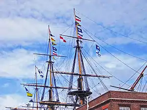 The term "England" was widely used at the time to refer to the United Kingdom; the British fleet included significant contingents from Ireland, Scotland, and Wales. Unlike the photographic depiction above, this signal would have been shown on the mizzen mast only and would have required 12 lifts.