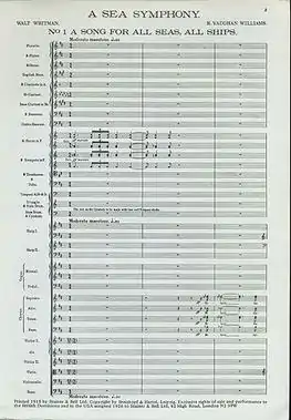 A Sea Symphony is an hour-long work for soprano, baritone, chorus and large orchestra written by Ralph Vaughan Williams between 1903 and 1909. The first and longest of his nine symphonies, it was first performed at the Leeds Festival in 1910 with the composer conducting, and its maturity belies the relatively young age — thirty — when he began sketching it. Moreover it is one of the first symphonies in which a chorus is used throughout as an integral part of the texture and it helped set the stage for a new era of symphonic and choral music in Britain during the first half of the 20th century. It was never numbered.