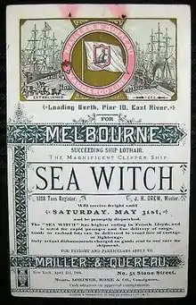 Sea Witch was 192 feet in length, had a 43-foot beam, and was of 908 tons burthen.[2] She was designed and built by the shipbuilding firm of Smith & Dimon in New York City as a purpose-built vessel for the speedy movement of high-value freight, such as porcelain and tea, from China to the United States East Coast. To this end, she was very heavily sparred and built with especially tall masts for a vessel of her size. Her 140-foot mainmast carried five tiers of sails, as did the shorter foremast and mizzenmast. She was briefly the tallest ship afloat, and is credited with being one of the first American "clipper ships."[2][3]