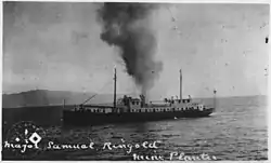 Circa 1901 the Coast Artillery took responsibility for the installation and operation of the controlled mine fields from the Corps of Engineers; these were planted to be under observation, remotely detonated electrically, and protected by fixed guns.[25] With that responsibility the Coast Artillery began to acquire the vessels required to plant and maintain the mine fields and cables connecting the mines to the mine casemate ashore, organized as a "Submarine Mine Battery" within the coast defense command.[25] The larger vessels, called "mine planters", were civilian crewed until the creation of the U.S. Army Mine Planter Service (AMPS) and Warrant Officer Corps to provide officers and engineers for these vessels in 1918.[31][32] The mine component was considered to be among the principal armament of coastal defense works.[32] When the Coast Artillery Corps was disestablished and the artillery branches merged in 1950,[25] some of the mine planter vessels were transferred to the U.S. Navy and redesignated as Auxiliary Minelayers (ACM/MMA).[33]
