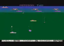Seafox is a game in which the player uses a submarine to destroy enemy ships.[3] The submarine is fully maneuverable beneath the surface by joystick control. Torpedoes can be fired upward at ships on the surface, or at enemy submarines. Red Cross hospital ships must be avoided.