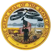 The Great Seal of the State of Iowa was created in 1847 (one year after Iowa became a U.S. state) and depicts a citizen soldier standing in a wheat field surrounded by symbols including farming, mining, and transportation with the Mississippi River in the background. An eagle overhead bears the state motto.