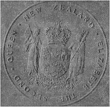 In 1977, the official instruments of the government in relation to New Zealand or New Zealand's dependent territories were either sealed with the Public Seal of New Zealand and in other cases with the Great Seal of the United Kingdom. The government of the Cook Islands and the government of Niue have concurred with a new single seal for all of the Realm of New Zealand.[1] The current seal depicts the Coat of arms of New Zealand surrounded by the lettering "Elizabeth the Second Queen New Zealand". Despite the passing of Queen Elizabeth II, use of this seal will be continued until a new Seal of New Zealand is proclaimed.[1]